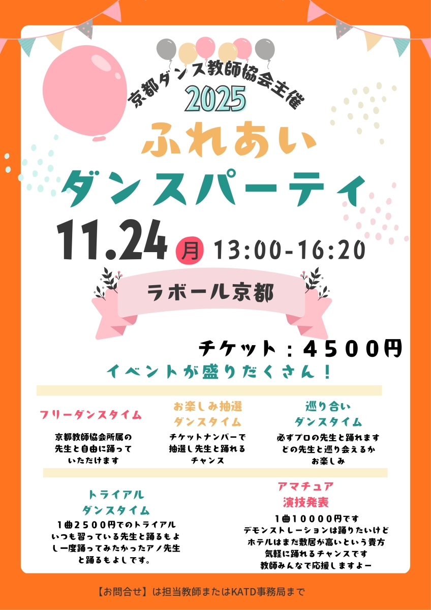 2025年11月24日(祝)秋のふれあいダンスパーティ 2025年10月09日 お知らせ[一覧]に戻る 2,025年度第2回メダルテストの日の午後に秋のふれあいパーティを開催します。奮ってご参加ください。